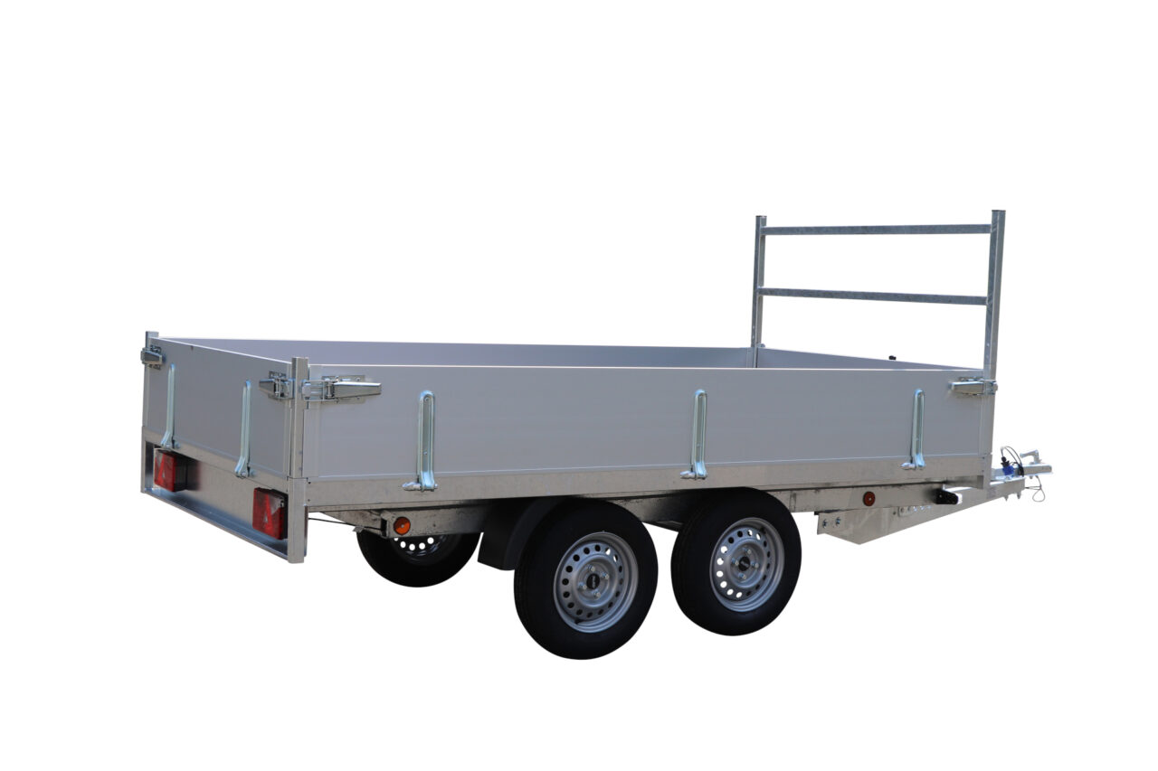 Dank seiner robusten Achse und des zuverlässigen Befestigungssystems bietet er zudem eine hervorragende Stabilität. Selbst auf unebenem Gelände bleibt er stabil und sicher. Die verstärkten Seitenwände des Kippaufbaus verhindern Verformungen beim Transport schwerer Lasten.